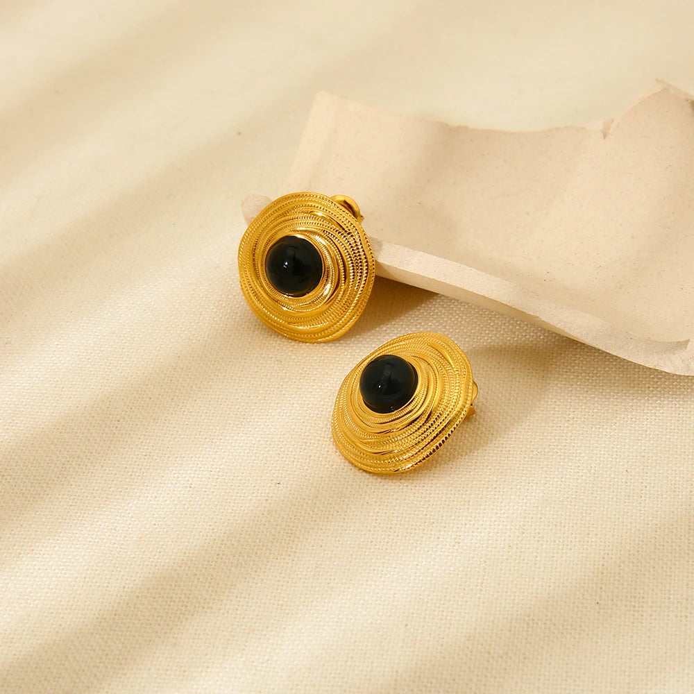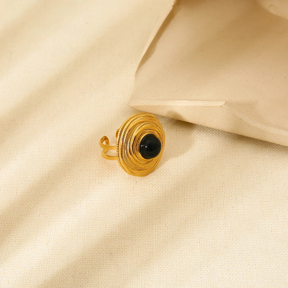 Elevate your style with this 18K Gold Plated Black Agate Jewelry Set, featuring a striking round pendant necklace, matching earrings, and an open ring. Crafted from high-quality stainless steel, this elegant set blends modern design with timeless sophistication. Perfect as a gift for weddings, anniversaries, or special occasions.